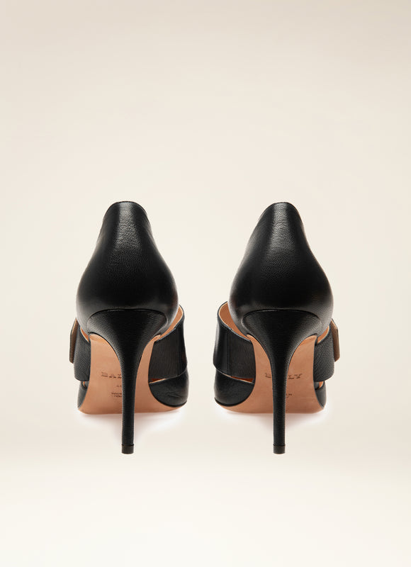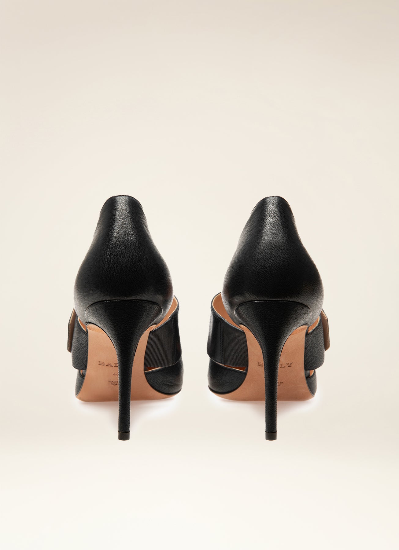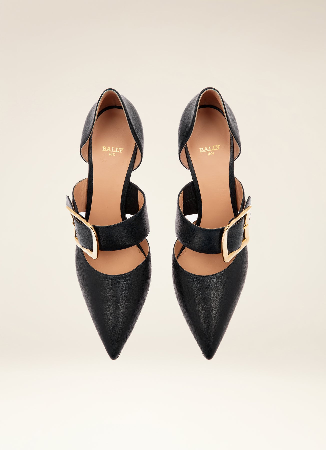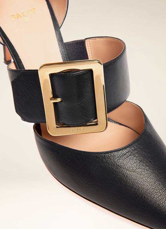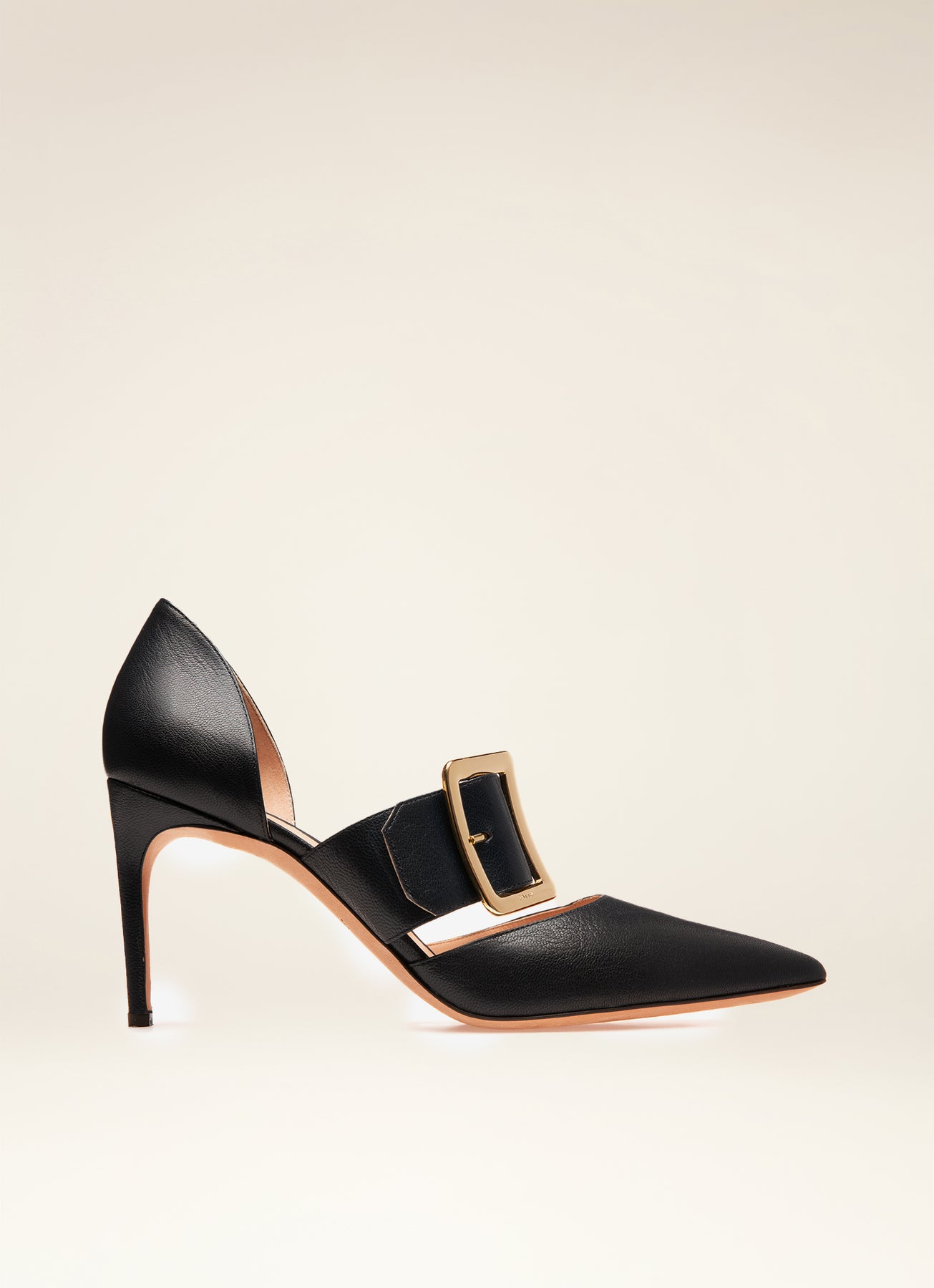 صُنعت أحذية جيسي الجلدية السوداء بقالب مدبب ومزينة بإبزيم جانيل الشهير، وتتميز بكعب ستيليتو عالٍ وحزام متقاطع .