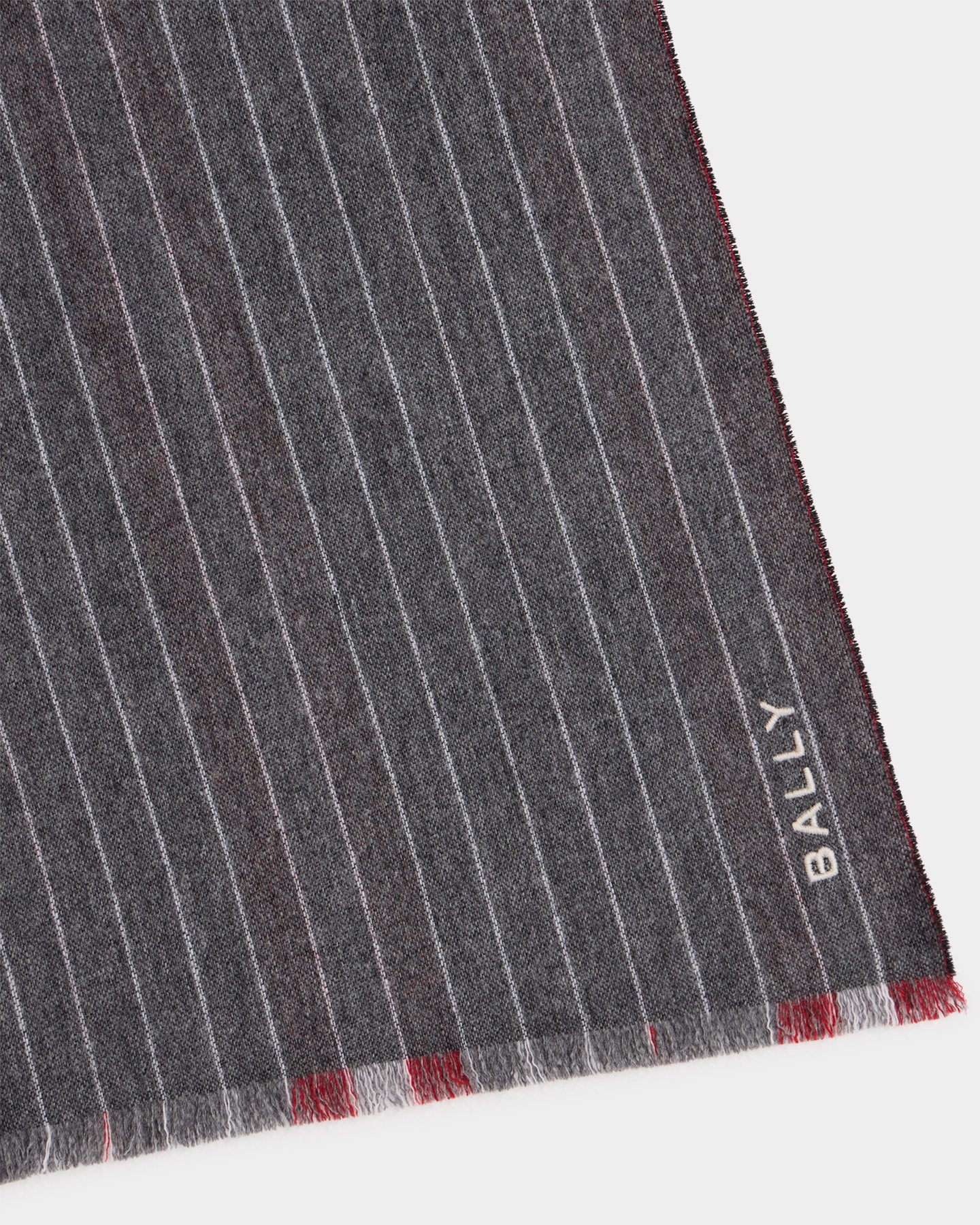 يتميز هذا الوشاح الصوفي الرمادي الداكن بزخارف Bally Ribbon على أحد الجانبين وخطوط رفيعة على الجانب الآخر.