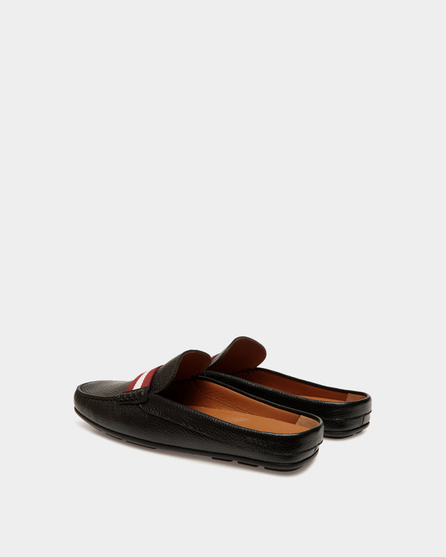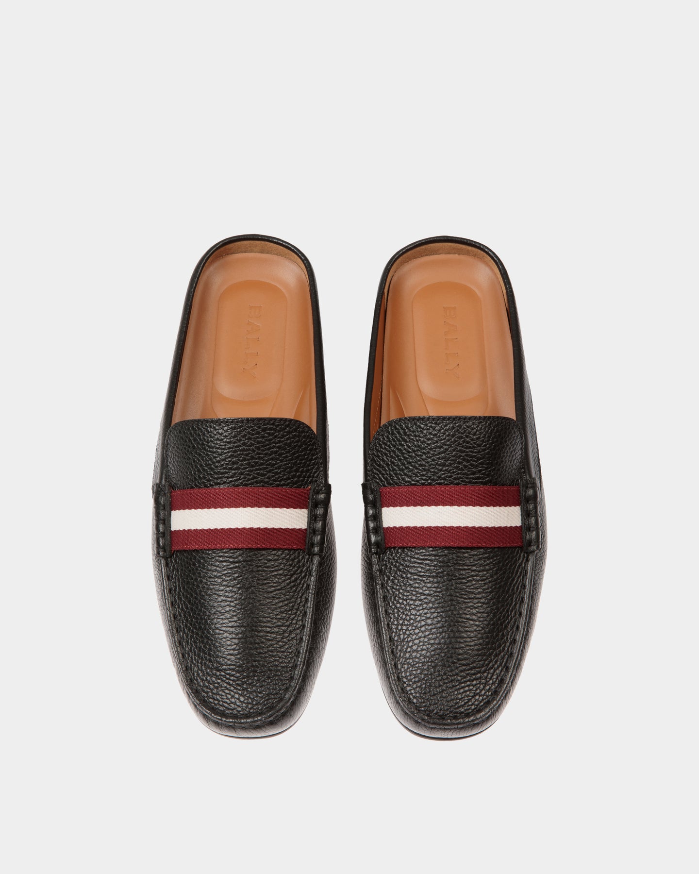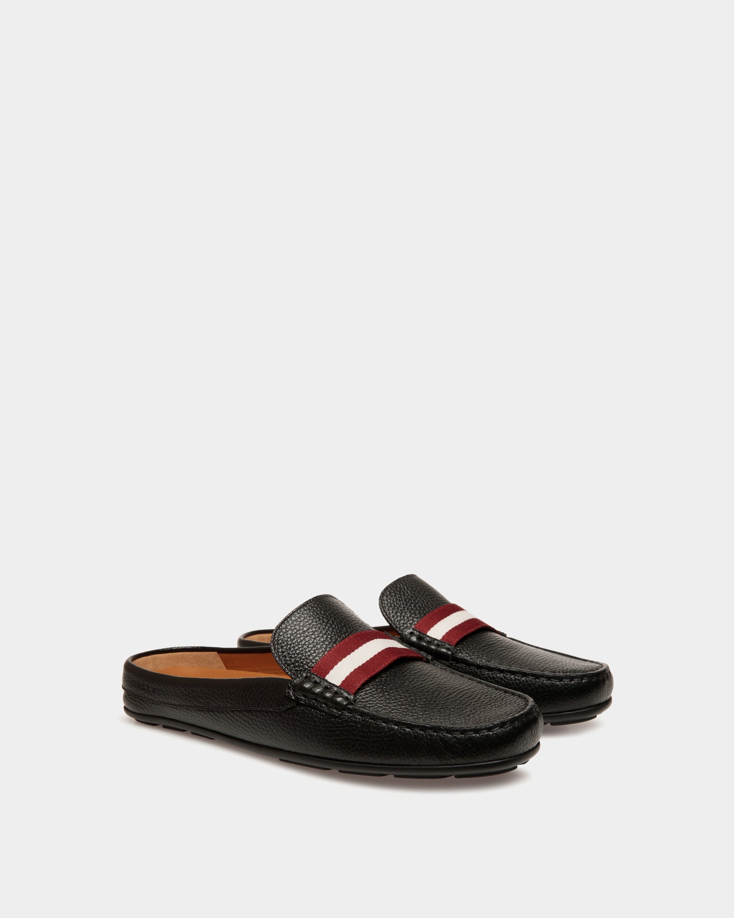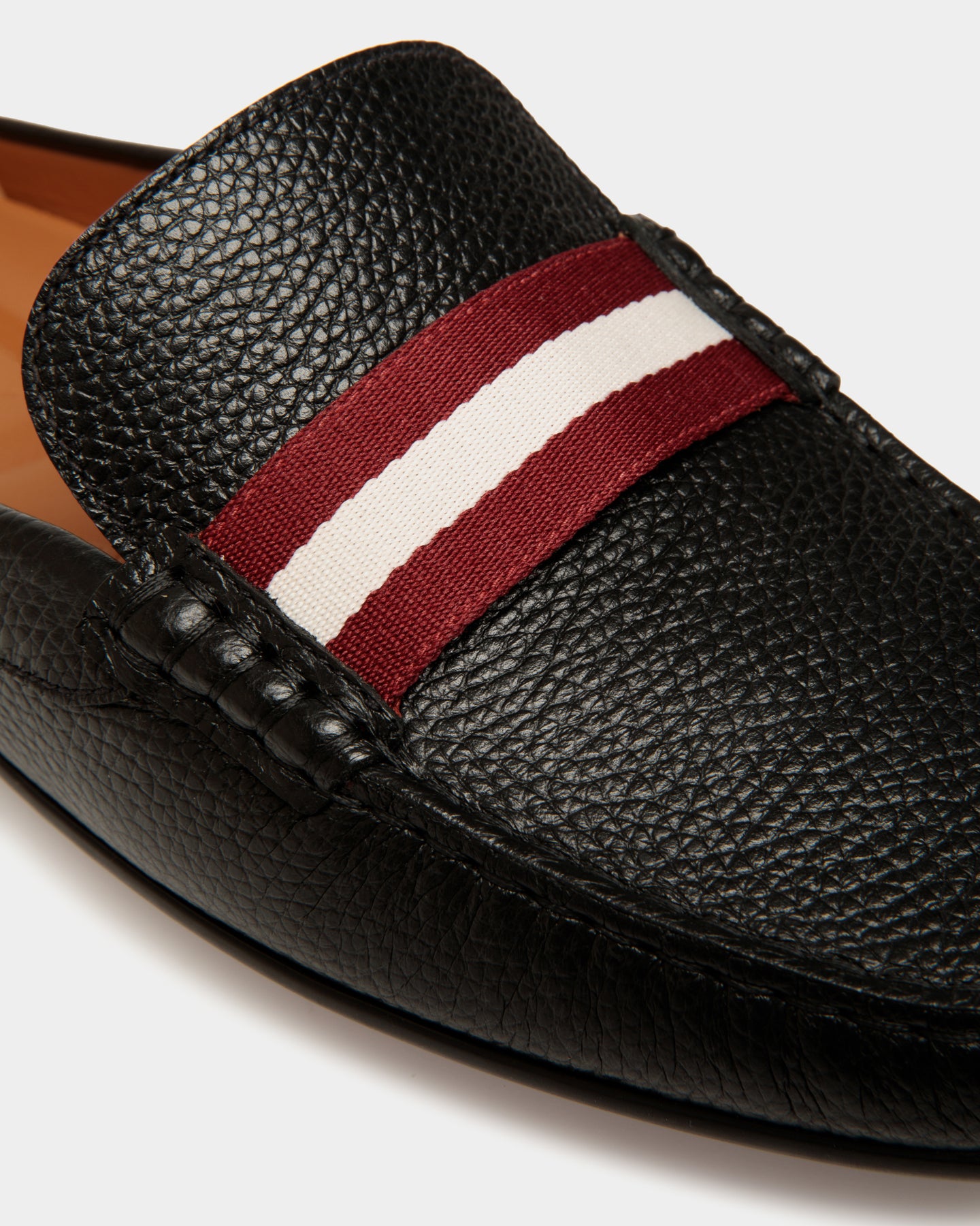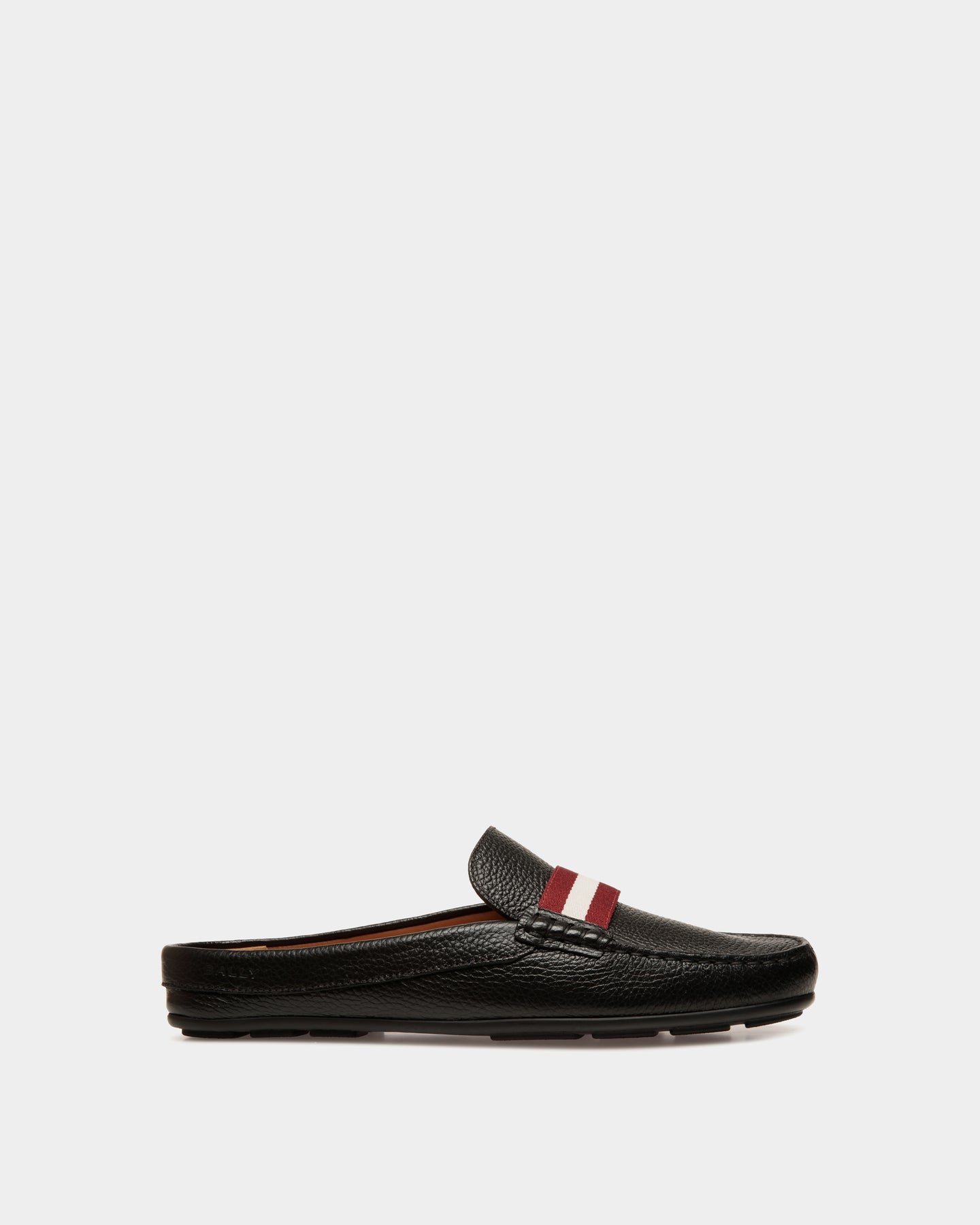 The Clay driver in black grained leather is made for comfort, with a mule silhouette and a split rubber sole. A Bally Ribbon... in red and white crosses the top.